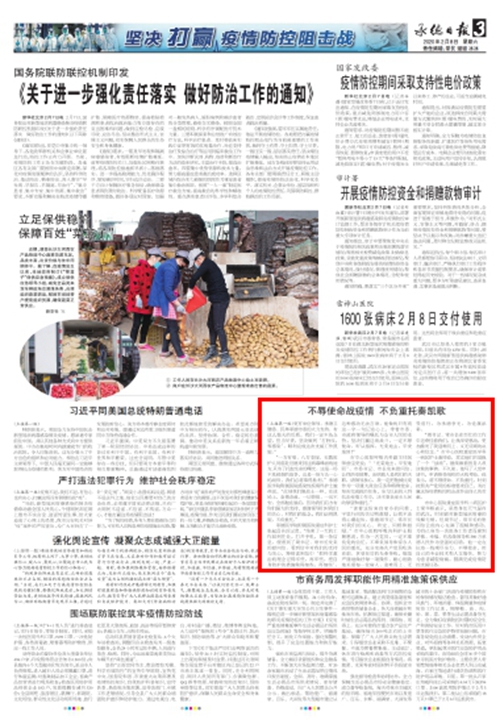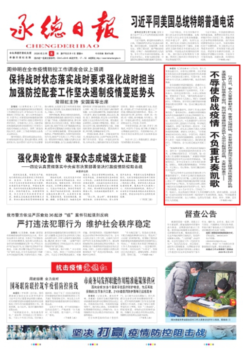 2月5日,省人大常委会副主任、市委书记周仲明,市长常丽虹向参加河北省支援湖北抗疫医疗队的承德医护人员们致信表示慰问,慰问信在承德赴湖北医护人员中引起强烈反响,大家纷纷表示—— 不辱使命战疫情 不负重托奏凯歌
