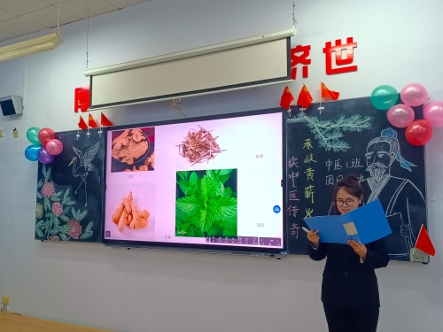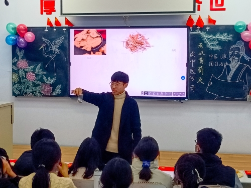 活动现场 讲悟医理,医道传承 2022级中西医临床医学张一然为同学们讲解甘草、茯苓、白术、柴胡等中药材的功效,特别分享“逍遥散”的配方与疗效。同学们学习到不少中医药理知识,更深入地了解传统医药,领悟中医魅力。张心如、陈婷、马志航三名同学以视频的方式分享了中医医家故事,介绍了中国古代四大女名医、医圣张仲景、神医华佗的故事。同学们了解了更多的古代名医故事,积极学习先辈经验,有利于更加深入地理解中医思想。
