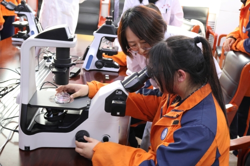 使用显微镜观察微观世界 此次主题党日活动,有效发挥了高校党员教师的专业引领作用与研究生党员的示范带动效应,通过支部共建协作,实现了“党建引领、资源共享、双向赋能、共同成长”的目标。今后,党支部将持续推动党建与育人工作的深度融合,将高校科研资源转化为育人力量,助力青少年科学素养提升,为培养具有科学精神的新时代人才贡献力量。