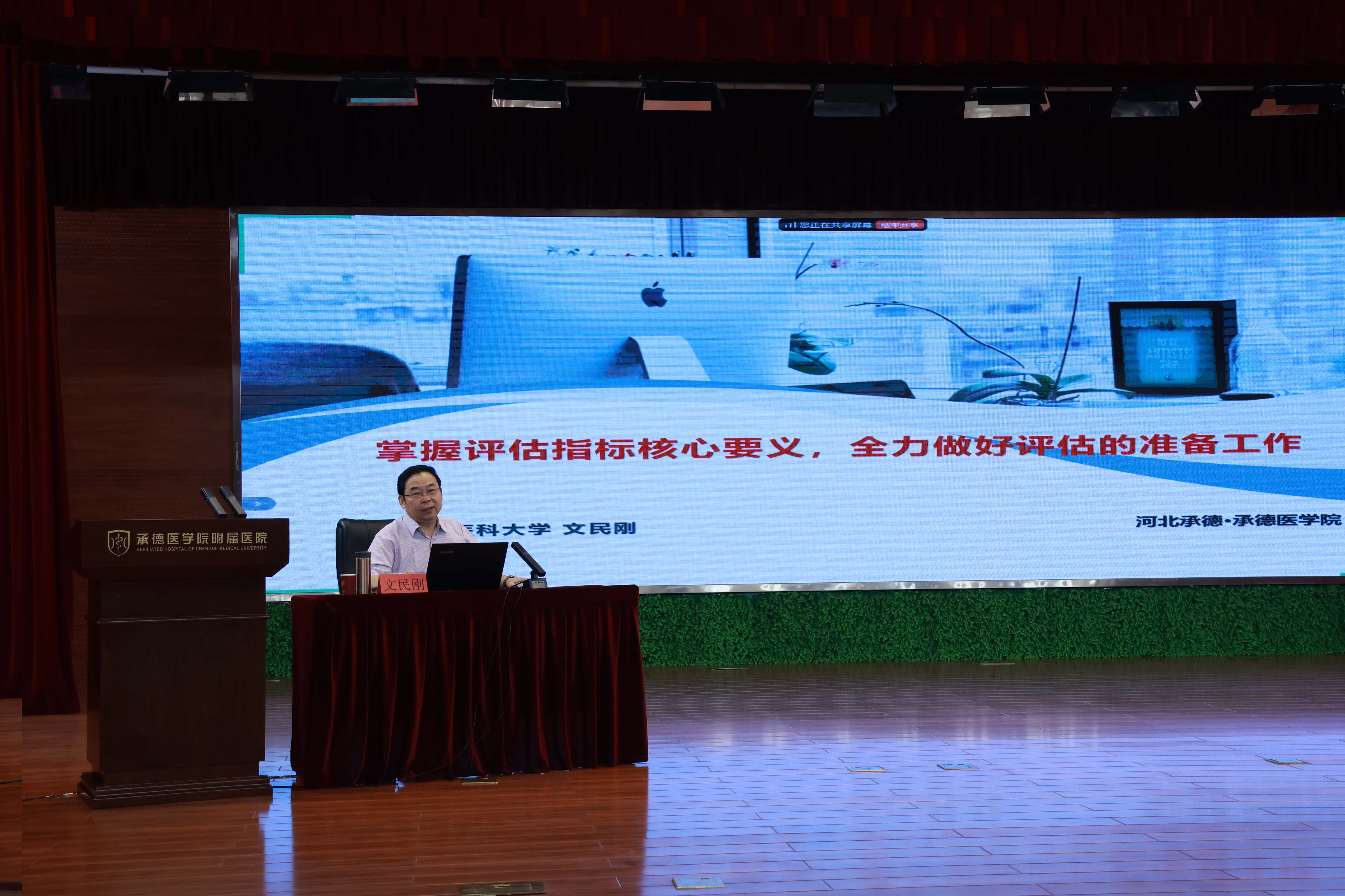 学校副校长、承德医学院附属医院党委书记、院长孙瓅贤教授主持大会 文民刚作了题为《掌握评估指标要义,全力做好评估准备》的专题讲座。他从新一轮本科教育教学审核评估的意义和特色切入,介绍了迎接考察的具体要点和医院层面应开展的准备工作,对OBE理念进行了阐释,强调了质量保障体系建设的关键作用,指出了现存问题并为各教学基地迎评工作提供了实操性的指导。