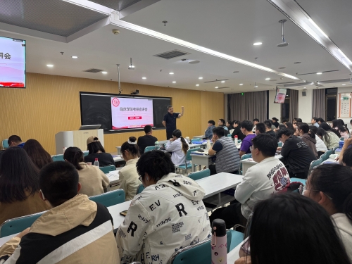 会上,张文军围绕考研报考精准度问题展开分析与指导。他首先向同学们介绍了近几年我校临床、影像、麻醉等专业考研率,鼓励同学们树立信心。随后,他结合当前医学专业就业形势分析了医学人才需求的变化趋势,并借鉴往届学生的考研经历,在院校选择等方面提供了实用技巧。他建议同学们拓宽思路、综合考量,为长远发展打下坚实基础,鼓励同学们明确目标、合理布局、敢于冲刺、力争卓越。他特别叮嘱同学们在关键时刻务必要保持身心健康,合理安排作息,保证张弛有度,以良好的心态和从容淡定之姿迎接大考。