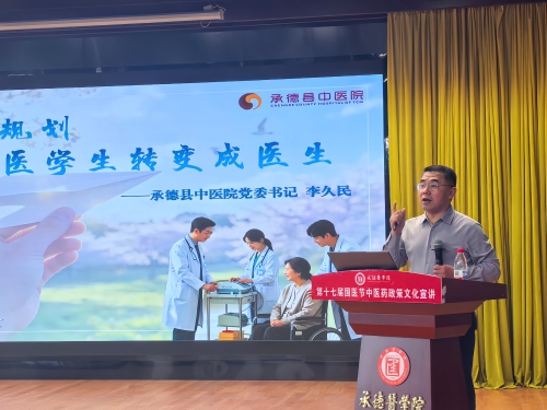 为深入解读新时代中医药发展政策,传承中医药文化精髓,引导青年学子坚定从医信念、明晰职业发展方向,4月15日,承德医学院中医系在图书馆八楼多功能厅举办第十七届国医节“宣讲政策要义 传承岐黄薪火”中医药政策文化宣讲活动。活动采取线上线下同步进行,特邀承德市卫生健康委二级调研员刘占安、承德县中医院党委书记李久民担任主讲嘉宾。中医系主任郭建恩、教师代表、研究生、毕业年级学生及在校各班班委参加活动。宣讲活动由中医系党委副书记李庆林主持。